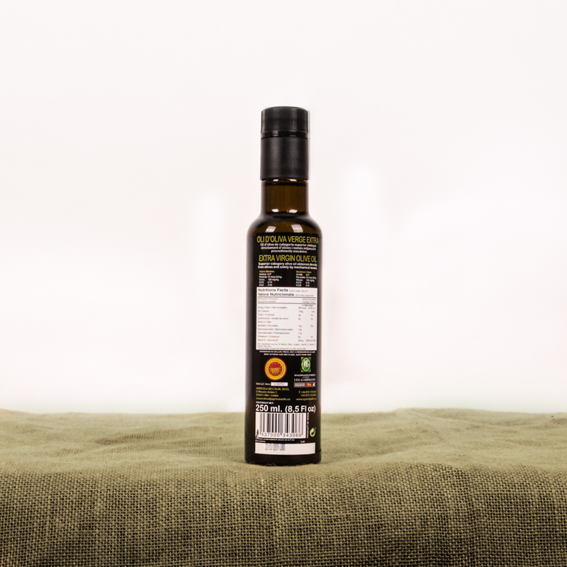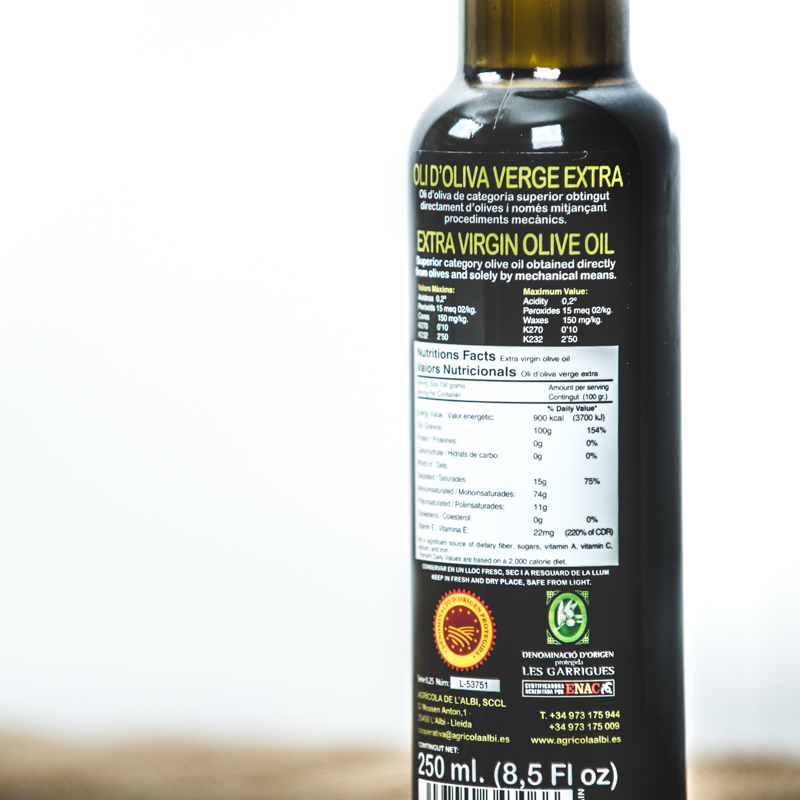 Ingredients: Oli d’ Oliva Verge Extra 100% arbequina. No conté cap tipus d’additiu alimentari.